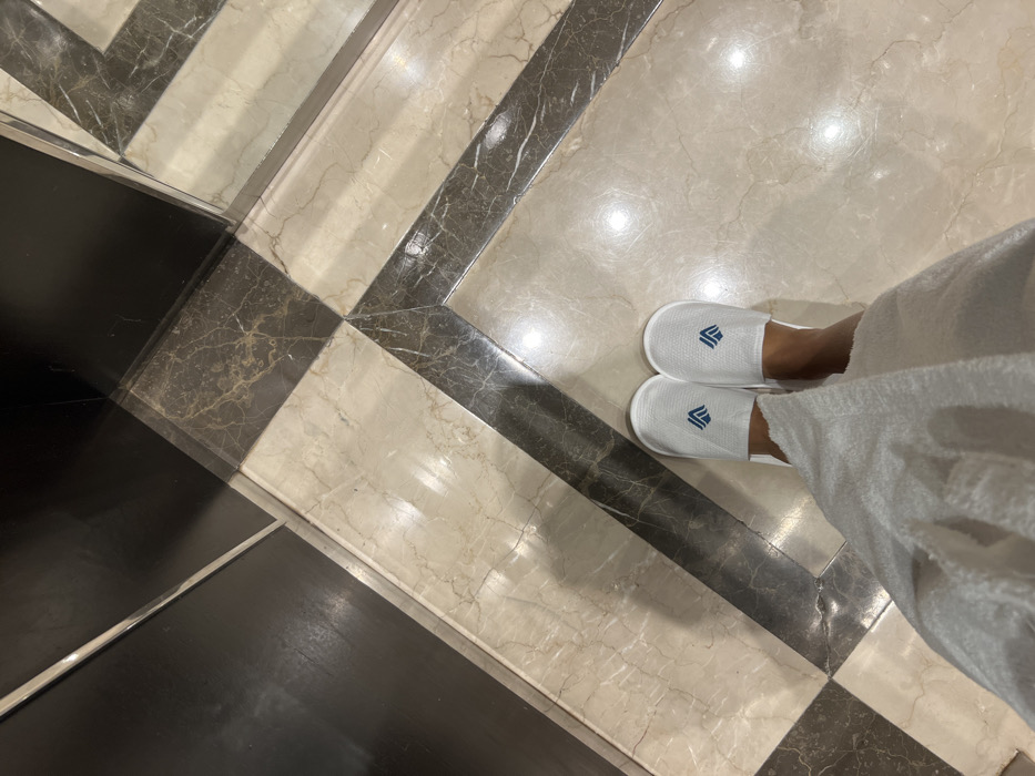 An overhead, downward-angle photograph captures a person's lower legs and feet, positioned centrally within an indoor environment in Bağcılar, Turkey. The individual is wearing a white terrycloth bathrobe, which covers the shins and ankles, and a pair of white, closed-toe disposable slippers, each bearing a blue stylized logo resembling an upward-pointing arrow or a stylized 'A' on the top. The feet are bare inside the slippers. The flooring is a highly polished surface of light-colored marble or stone, predominantly beige with subtle darker veining, intricately patterned with contrasting dark gray-brown marble strips that form geometric outlines and diagonals. Large, reflective black panels or tiles occupy portions of the floor, notably in the upper left and lower left, creating stark contrast and reflections of ambient light. The overall scene suggests an interior space consistent with a hotel room, bathroom, or spa facility.