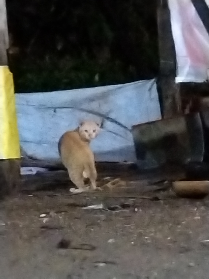 An orange cat is looking back over its shoulder at the viewer. The cat is standing on dirt and debris. Behind the cat is a blue tarp, and a dark background of trees or foliage is visible. A yellow object is on the left, and a dark post and some white cloth are on the right. A wooden bowl is on the ground to the right of the cat. The image is grainy.