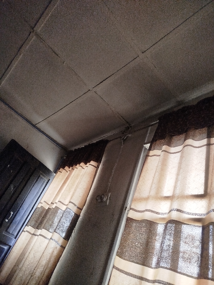 The image depicts an interior scene in Mape, Nigeria, viewed from a low angle looking upwards towards the ceiling and walls. The ceiling consists of light grey, possibly plasterboard or acoustic tiles, arranged in a grid pattern with visible seams. Along the top edge of the walls, a dark trim or molding is present, with some visible wiring or conduit. Two sets of patterned curtains are drawn across windows on the right side of the frame, obscuring the exterior view. These curtains are light beige/cream with horizontal stripes of a darker brown patterned fabric. The top of the curtains features a ruffled valance of solid dark brown. Diffused natural light penetrates through the curtains, casting subtle shadows from the window frames onto the fabric. A section of a wall, painted light grey, is visible between the curtained windows, with a white electrical outlet or switch and some visible wiring mounted on its surface. To the far left, a portion of a dark-colored, possibly wooden or metal, framed door or window with a handle is partially visible. No individuals, actions, or direct interactions are present in the scene.
