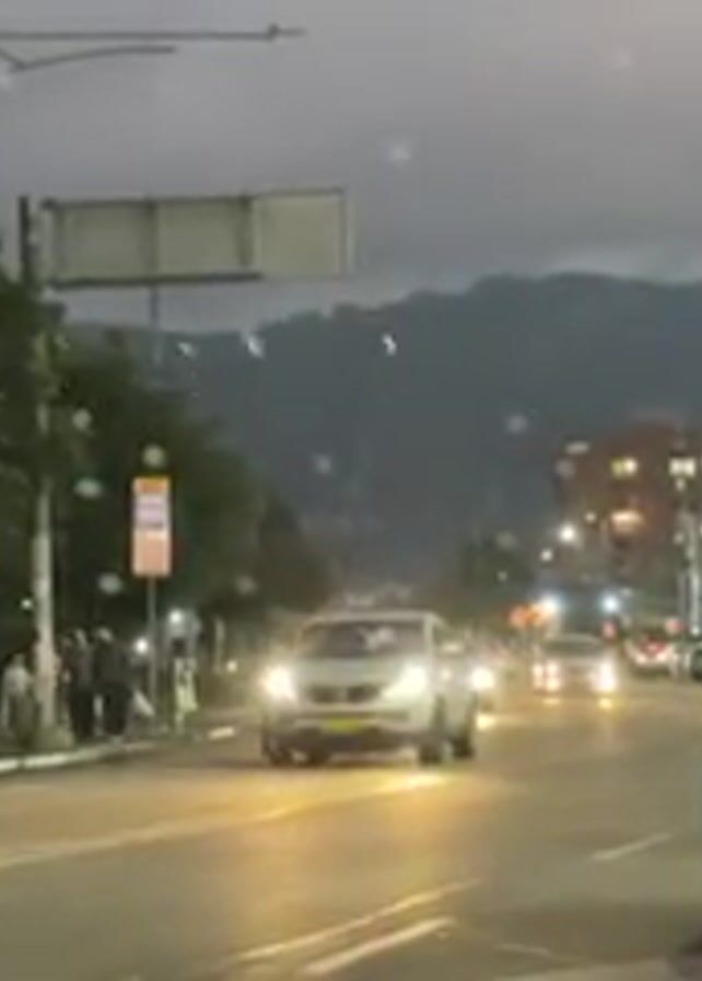 street scene on a rainy evening. Several cars are driving on the road, with a bus stop on the left side of the frame. A cyclist wearing a bright pink delivery backpack with the Rappi logo rides in front of the cars. Buildings and mountains are visible in the background.