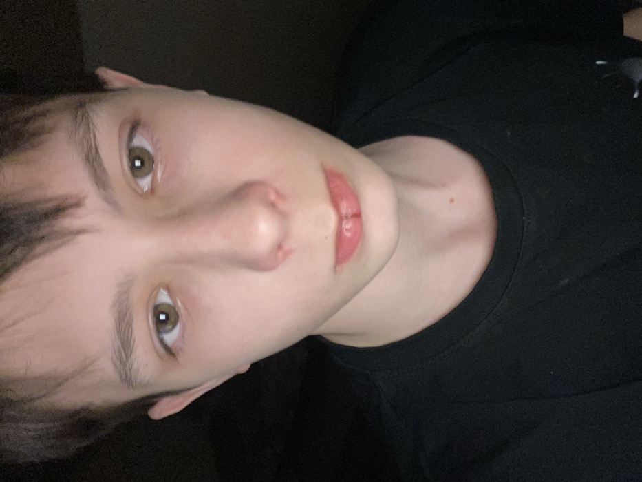 A close-up, frontal portrait depicts a young individual with fair skin and short, dark brown hair