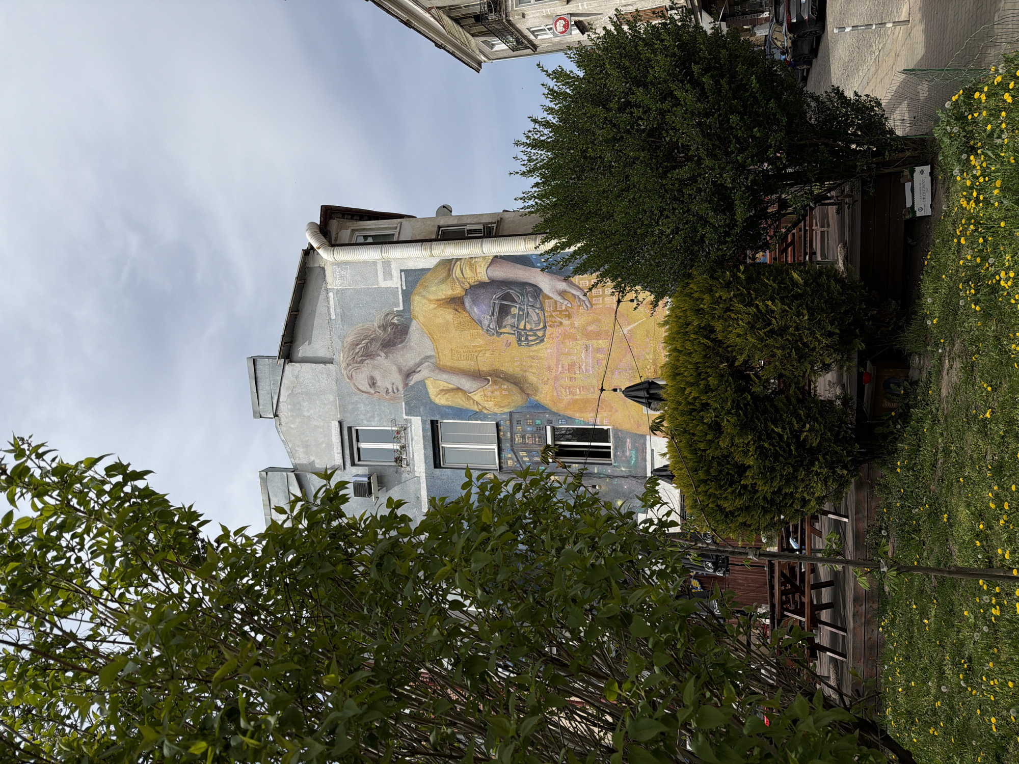 n outdoor scene in Sofia, Bulgaria. A multi-story building displays a large mural depicting a woman in a yellow garment holding an American football helmet. The mural is painted on the side of the building. In the foreground, green trees and vegetation partially obscure the view of the building. A wooden deck with picnic tables is adjacent to the building, suggesting an outdoor dining or recreational area. The sky is visible with some cloud cover.
