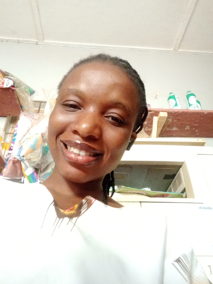 A close-up image depicts a single individual, appearing to be an adult female of African descent, facing the camera with a wide smile that exposes her upper and lower teeth and glossy lips. Her hair is styled in dark braids. She wears a white top with what appears to be a dark, dripped pattern on the front, and a visible colorful patterned neckline in shades of yellow, red, and black. A dark earbud is visible in her right ear. The background suggests an indoor commercial setting. To the left, a portion of a display shelf is visible, holding multiple items, possibly packaged snacks or goods, encased in clear plastic bags. Red and white packaging, with "VITA" partially legible, is seen on one item. To the right, a white office machine, possibly a printer or copier, with "olivila" faintly discernible on its front panel, is present. A green-covered item, resembling a book or folder, rests atop this machine. Above the machine, a wooden shelf holds three green plastic bottles with white caps. The ceiling is white with visible seams. The environment suggests an establishment such as a small retail shop, a business center, or a cybercafé, located within the city of Nsukka, Nigeria.