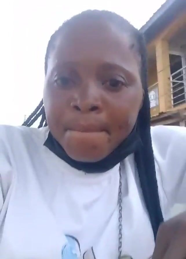A woman with dark skin and braided hair is recording a video of herself. She is wearing a white t-shirt and a black face mask is pulled down around her neck. A silver chain is visible around her neck. Her facial expression is somewhat worried or concerned. Behind her, there's a two-story building painted in shades of orange. The sky is visible, and the top of a sign with lettering is at the top of the frame. The camera appears to be moving slightly.