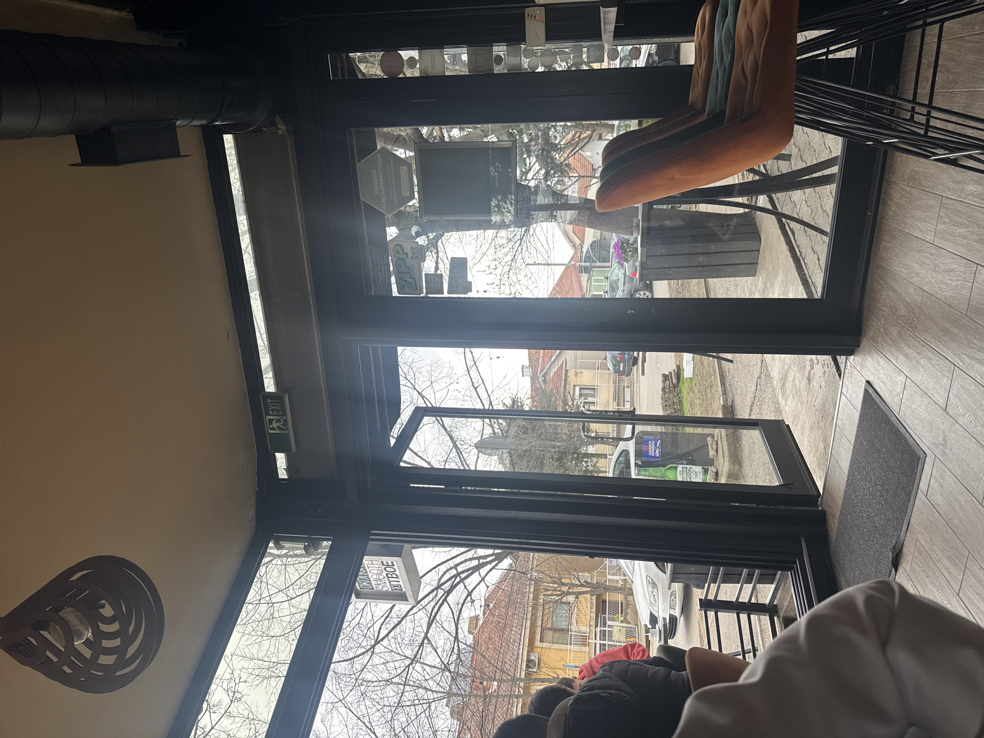 The image depicts an interior view of a commercial establishment, likely a cafe or bar, in Kumanovo, North Macedonia, looking out through a glass facade towards a street scene on an overcast daytime. In the foreground, partial views of at least two individuals are visible with their backs to the camera on the left. One person wears a dark jacket over a red garment, while another wears a light-colored top. On the right, two high-backed bar stools with black metal frames are present; the closest is upholstered in orange fabric, and the one behind it in dark green. The interior floor is covered with light brown, wood-patterned tiles, with a dark grey welcome mat positioned at the threshold of the entrance. The ceiling is off-white, featuring a dark, open-lattice, teardrop-shaped light fixture in the upper left and a black, exposed circular ventilation duct along the upper right. A green "EXIT" sign with a running figure pictogram is affixed above the central glass door. The exterior scene, visible through the dark-framed glass doors and windows, shows a paved street or sidewalk. Deciduous trees with bare branches line the street, indicating late winter or early spring. Across the street, residential buildings with red tiled roofs are visible, including a prominent two-story yellow building with a balcony. A white sedan is parked or moving on the street. Outside the establishment's entrance, a dark cylindrical planter containing purple flowers is situated. Various decals and reflections are visible on the glass, including a "ZIPP SPOT" logo, a grey hexagonal sign, and an advertisement featuring a green beer bottle (identifiable as "SKOPJESKO"). A vertical rectangular sign with Cyrillic text, partially readable as "SMOOTH," is also visible through the left glass panel. Some loose bricks or debris are scattered on the ground near the right side of the exterior view.
