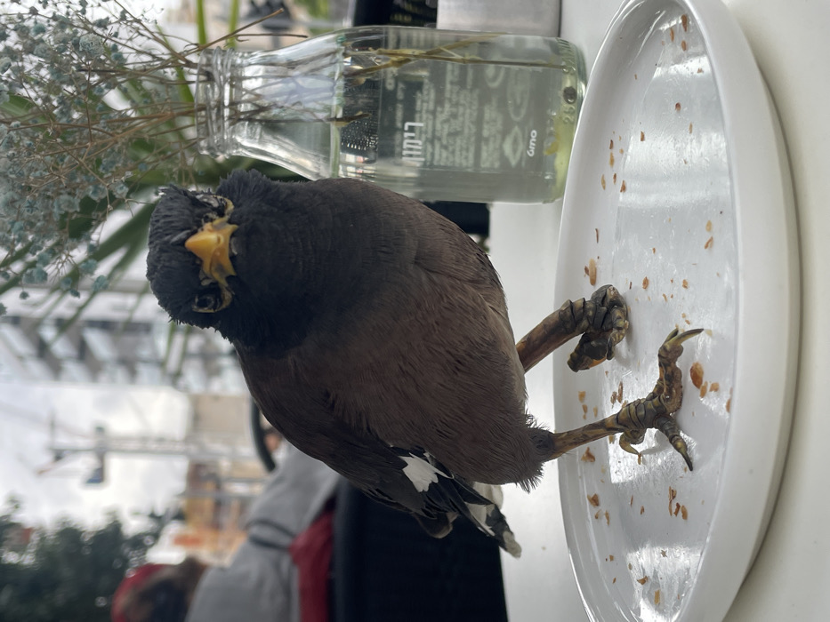 - "A Common Myna (Acridotheres tristis) is centered in the foreground, directly facing the viewer from a low perspective" by FM-k41Xm2, licensed under CC BY 4.0