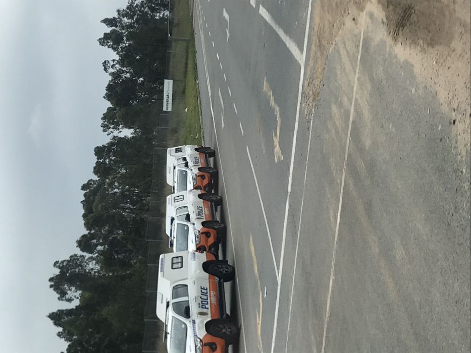 A line of white police vehicles with orange accents is parked on the side of a paved road. Behind the vehicles is a dense line of trees and a fenced-off area with a sign visible. The road has lane markings and turn arrows, indicating a designated area for traffic. The sky is overcast. The photo appears to be taken on a gloomy day, casting a muted tone over the scene.