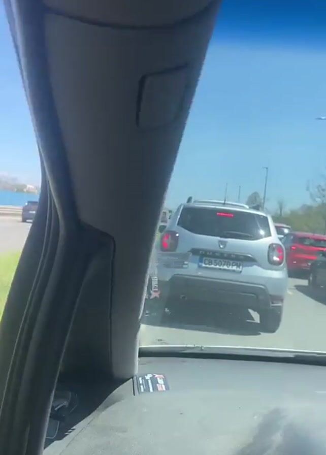 congested highway on a sunny day, as seen from inside a car. The car is stopped in traffic behind a silver Dacia Duster. Other vehicles, including cars, trucks, and vans, are also stuck in traffic on the multiple lanes of the highway. The highway is lined with grass and light poles. Electrical power lines are visible in the distance. The dashboard and steering wheel of the vehicle filming the scene are visible in the foreground. The side mirror is briefly visible as the camera angle is adjusted.