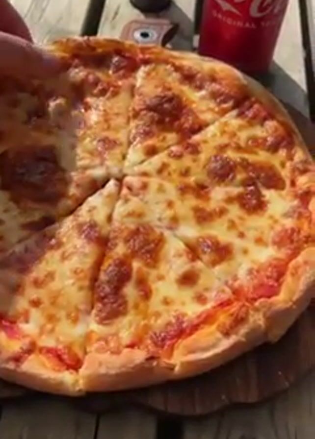 A hand pulls a slice of cheese pizza off a wooden cutting board on a wooden table. A can of Coca-Cola and a brown bottle stand nearby. The pizza has melted cheese and a thin tomato sauce. The cheese stretches and breaks as the pizza slice is lifted.