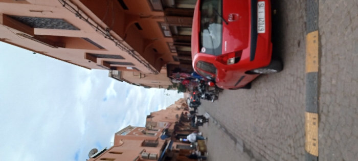 A narrow street in Marrakech, Morocco, is lined with peach-colored buildings and filled with motorbikes and pedestrians. A red car is parked on the right side of the street, close to a curb. The street extends into the distance, filled with activity and commerce. The sky is overcast.