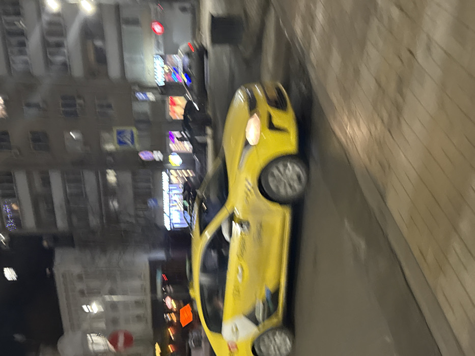 The image depicts a nighttime urban street scene in Rostov-on-Don, Russia. A bright yellow Kia Rio sedan, identified as a taxi, is in motion across the foreground, moving from left to right. Its headlights are illuminated, and motion blur is visible on the vehicle and its wheels. A figure is discernible in the driver's seat. The taxi features a white and grey graphic on its rear passenger door and fender. The street is asphalt, and a paved sidewalk constructed from light-colored interlocking pavers occupies the immediate foreground. A dark, cylindrical object, consistent with a bollard or refuse bin, is positioned on the sidewalk's edge to the right. In the background, on the left, is a lighter-colored, multi-story building with visible architectural details and several windows. A red circular "No Entry" sign is affixed to a pole near this structure. To the right, a darker, taller, multi-story building with numerous illuminated windows forms the backdrop. The ground level of these background buildings displays multiple commercial storefronts, characterized by various brightly lit signs in colors such as blue, pink, red, and white. A blue square sign depicting a white pedestrian crossing symbol is visible in the mid-ground, along with other unidentifiable street signs. A lighter-colored sedan is partially visible further down the street behind the yellow taxi. The environment is illuminated by artificial light sources, indicating nighttime conditions. The road surface appears dark and possibly damp.