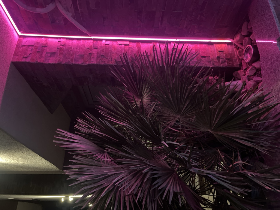 A lush palm tree occupies the frame's foreground, bathed in a vibrant pink light emanating from a neon strip above. The background showcases a textured wall, possibly stone, also saturated in pink. A speaker is visible on the wall, nestled among the rocks. The contrasting architecture adds depth, with a portion of the building in brighter light.