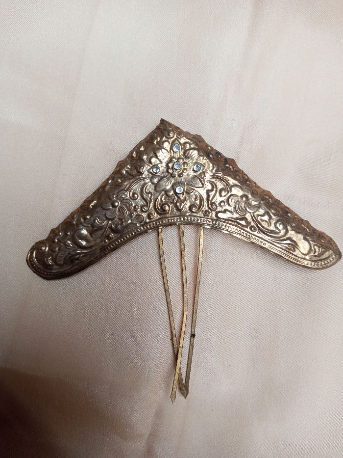 - "A gold-toned metallic hair ornament, likely a comb or tiara fragment, is centrally depicted against a light beige, subtly textured fabric background" by FM-tIznO2, licensed under CC BY 4.0