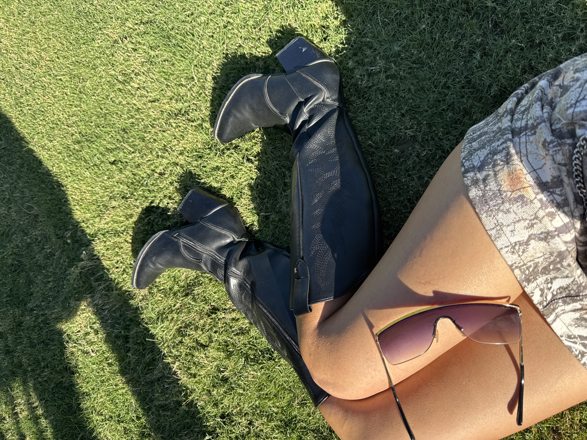 A person is reclining on a grassy lawn in Palm Springs, United States of America. They are wearing knee-high black leather boots with a Western style. A pair of rimless gradient sunglasses rests on the person's bare legs, which are partially covered by a patterned skirt or shorts. The grass is neatly trimmed. Sunlight creates shadows across the scene.
