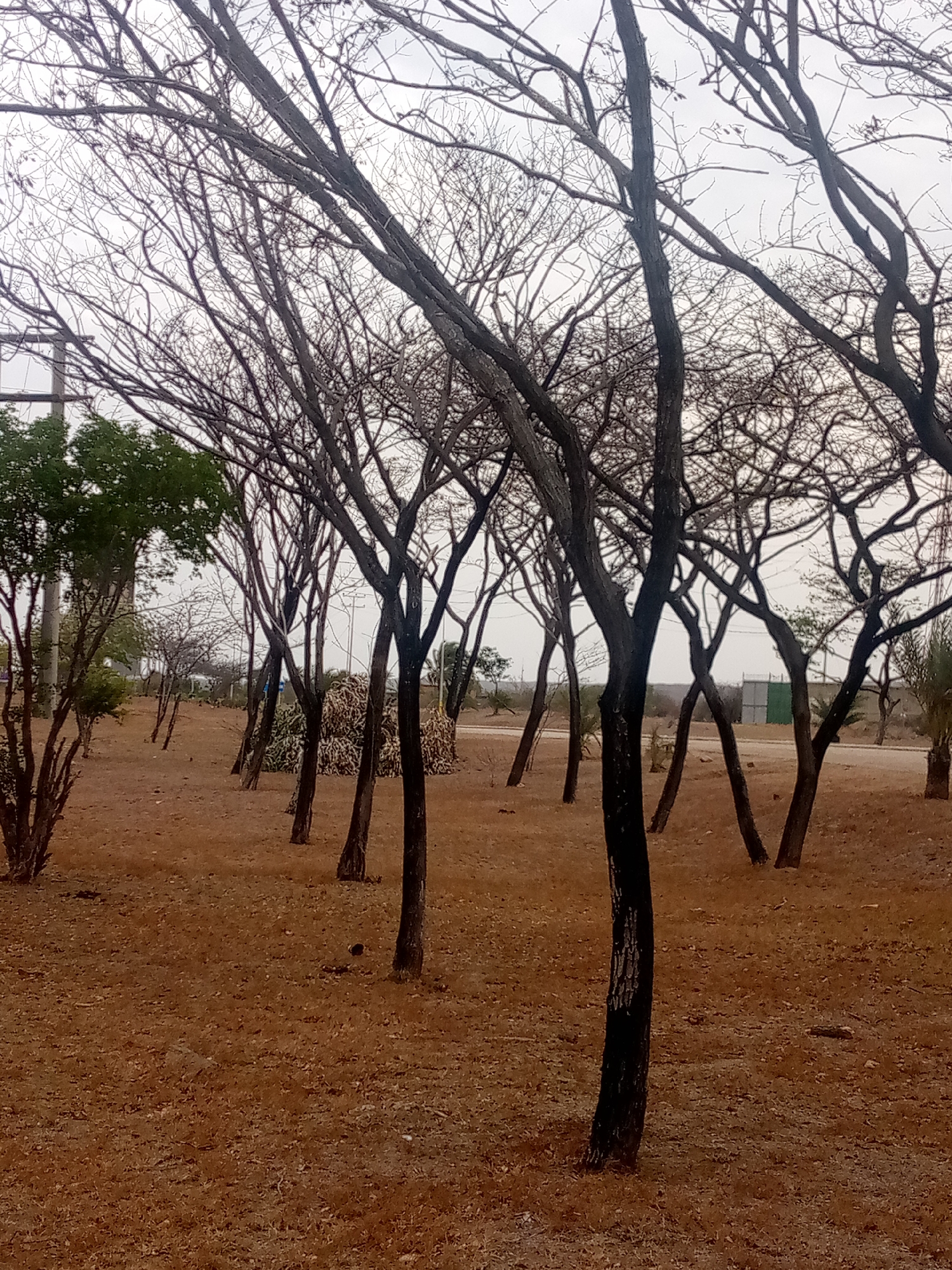 The image depicts a grove of trees with bare branches, likely deciduous trees during a dormant season. The ground is covered with dry, brown vegetation. The sky is overcast. In the background, structures and distant green trees are visible, suggesting a park or open area within a developed environment. There are no people visible in the image. The scene appears to be located in a somewhat arid region. The location is given as Las Guevaras, Venezuela, but this cannot be independently verified from the visual information.