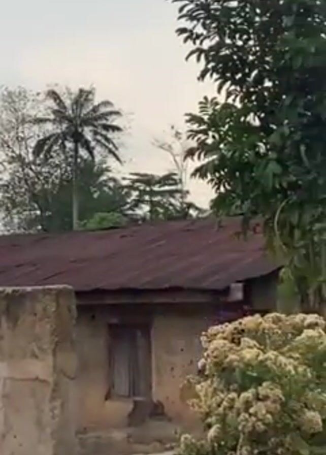 A rooster stands atop a concrete brick wall crowing. Behind the wall is a simple, run-down structure with a rusted metal roof. There are trees and other foliage. The sun shines through the clouds in the sky. The scene is likely in a rural or less developed area.