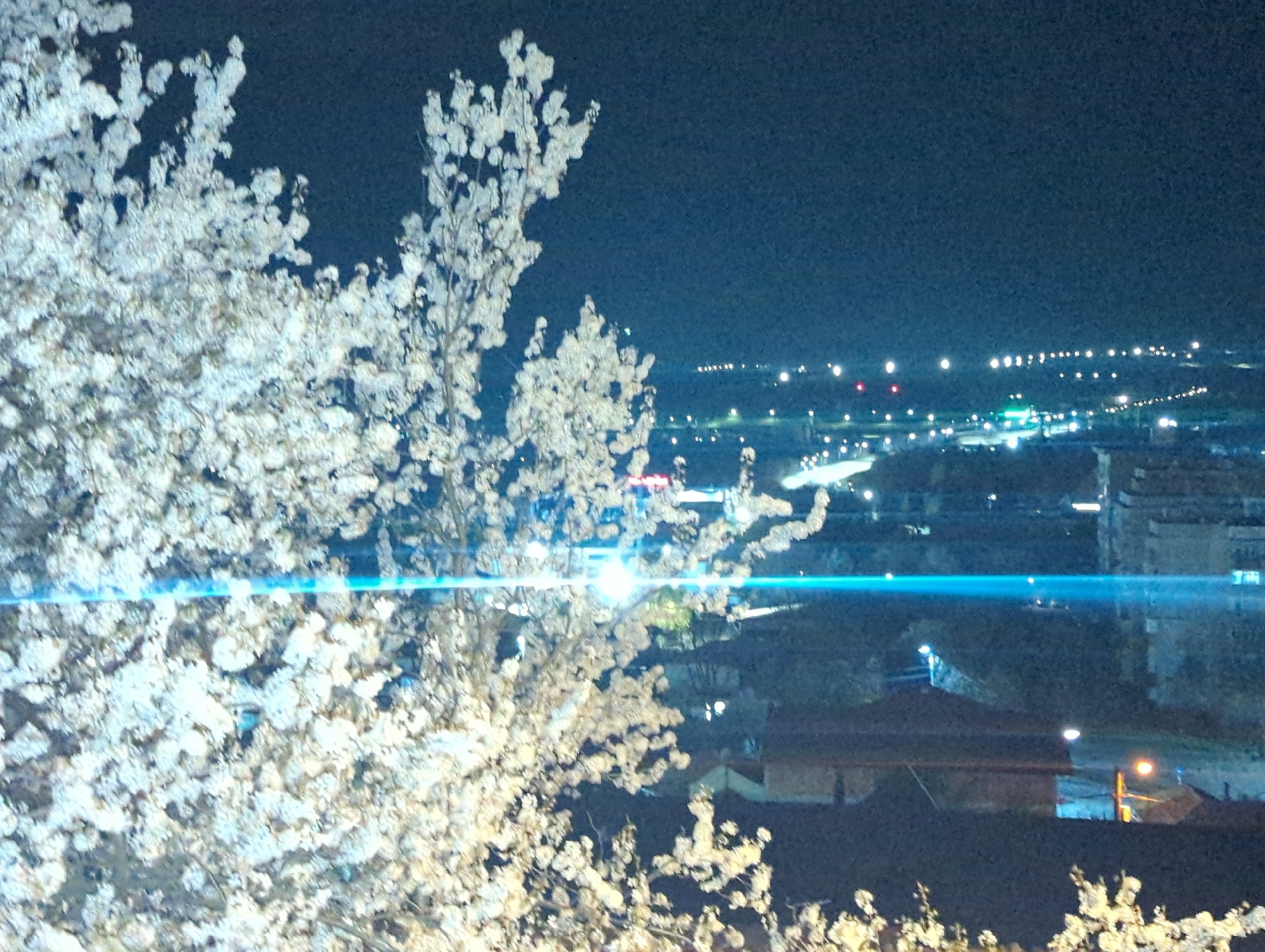 - "A nighttime shot depicts trees with white blossoms in the foreground, obscuring a distant cityscape" by FM-Zkhj02, licensed under CC BY 4.0