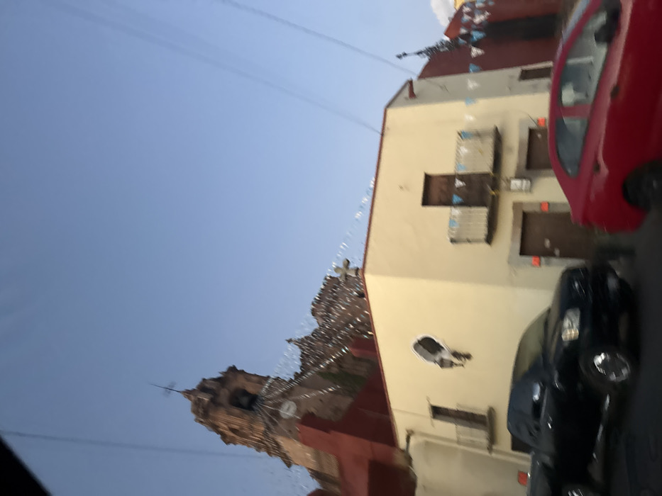 An upward, angled view shows a light-colored building with a red roof, adorned with hanging decorations. Adjacent is a church steeple against a pale blue sky. A red car is partially visible on the right, alongside a black car parked in front of the building. The perspective gives a distorted impression of the scene.
