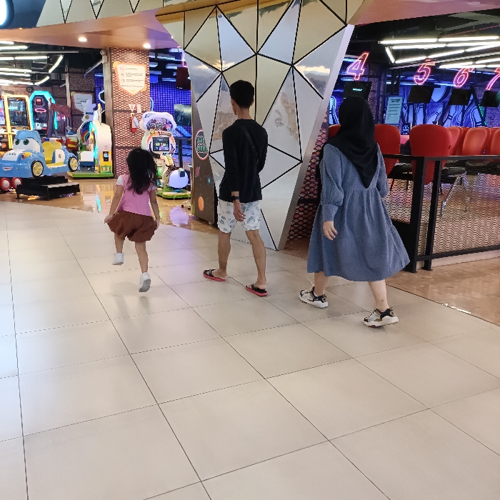 The image depicts a scene inside a mall, likely a gaming arcade, in Kecamatan Mijen, Indonesia, located at coordinates -7.045 latitude and 110.324 longitude. Three individuals are present: a young girl wearing a pink shirt and brown shorts, walking away from the viewer, a man wearing a black shirt and shorts, walking toward the viewer, and a woman wearing a blue dress and a hijab, walking toward the viewer. The girl is walking towards the left side of the image, while the man and woman are walking on the right side. The scene features arcade games in the background, including a colorful toy car. The arcade area is decorated with a colorful, abstract design, with large numbers in red on the wall, suggesting a prize or point system. The floor is tiled in a light gray color, and the walls are painted a light beige. The overall scene presents a casual, light-hearted atmosphere.