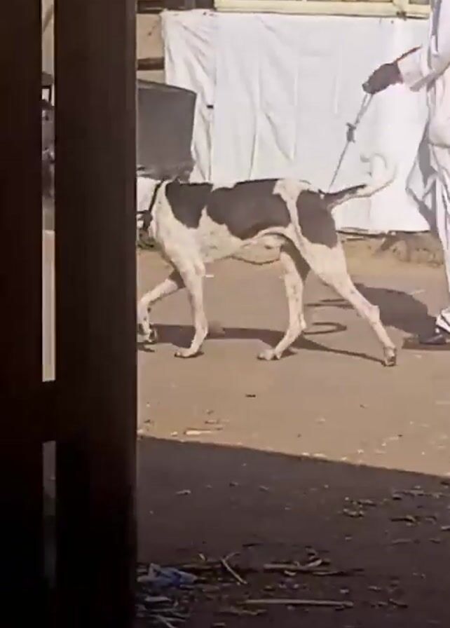 medium-sized dog with white fur and large brown spots being walked on a leash by a person wearing a white garment