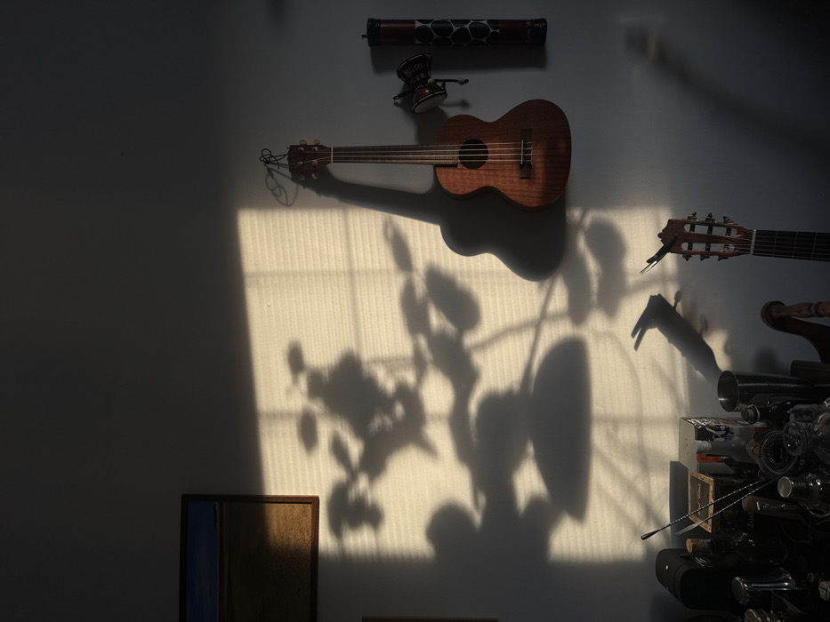 The scene depicts an interior residential space in Hainburg an der Donau, Austria, characterized by strong directional natural light and prominent shadows cast upon a light-colored wall. On the upper left of the wall, a rectangular framed artwork, approximately horizontal, displays a landscape with a field and a sky. To the right of the center, a wooden ukulele hangs vertically by its headstock from a hook, casting a dark shadow to its immediate left. Adjacent to the ukulele on the right, a small, dark hand drum with a strap is suspended. Further right, a tall, cylindrical decorative item, featuring a dark, repeating geometric pattern, is affixed vertically to the wall. The central and left portions of the wall are illuminated by a warm, intense light source, likely a window to the right, which casts distinct horizontal lines from blinds across the wall and through a prominent, multi-branched shadow of a potted plant. Various other shadows are visible, including an angular, rabbit-like silhouette near the bottom center. In the lower left quadrant, a surface, possibly a bar cart or counter, holds an array of bar equipment. Visible items include a tall metal cocktail shaker or jigger, a long stirring spoon, multiple small glass bottles, and a box labeled "Woodford Reserve." In the lower right quadrant, the headstock and a portion of the neck of a classical or acoustic guitar are visible, angled towards the right, with a capo clamped onto the headstock. No individuals or active interactions are present within the frame.