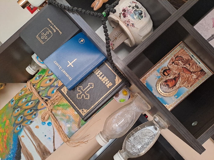 This image displays a collection of religious and decorative items arranged on dark brown, modular shelving units in a residence located in Spanchevtsi, Bulgaria. On the upper shelf, from left to right, a framed artwork featuring a vibrant peacock feather design, tied with natural twine, is visible. Adjacent to it are two clear glass bottles with white caps; the left bottle has an embossed image, and the right features a subtle cross. Next, a small, multi-colored spherical object is present. Following this, three books are stacked: a black book with a gold Orthodox cross and Cyrillic text "ПСАЛТИР" (Psalter), a blue book with a gold cross and Cyrillic text "НОВИЯТ ЗАВЕТ" (The New Testament), and a black box-like item with a gold emblem resembling a cross within a jar and Cyrillic text "Библия с Библейски студии" (Bible with Biblical studies). A black prayer rope with green beads is draped over these books, extending to the right. Further right, a light-colored, possibly ceramic, pot adorned with floral patterns contains a folded paper item. A golden object, possibly a perfume bottle, is partially visible in the upper right background. On the lower shelf, a framed Orthodox icon depicting the Theotokos (Virgin Mary) holding the Christ Child is prominently displayed. Text on the icon is in Cyrillic. To the right of the icon, a partially visible decorative box or book with a subtle pattern is present. The shelves are positioned against a light-colored wall. No individuals are depicted in the scene.