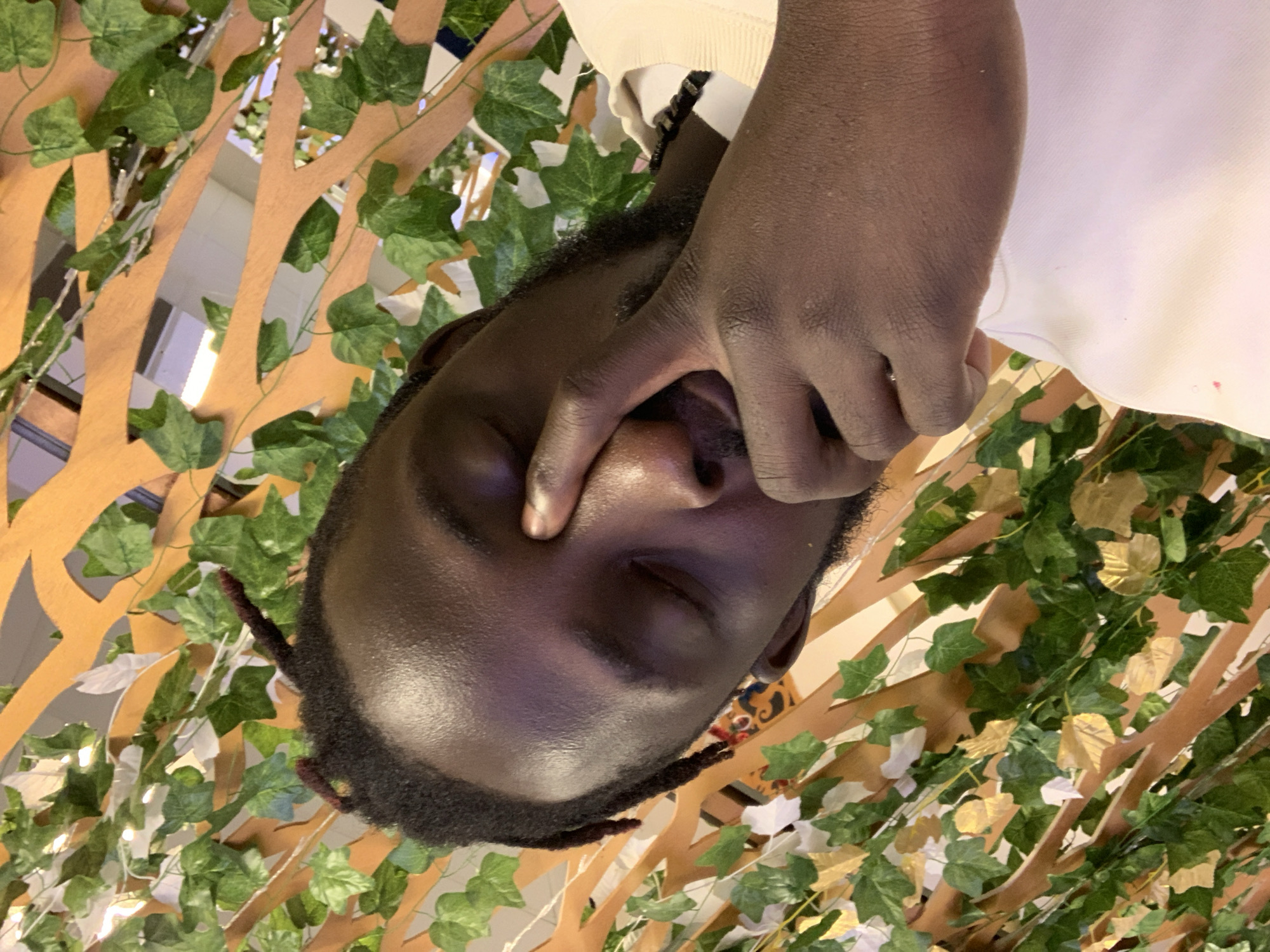 A close-up, slightly distorted image shows a dark-skinned individual with a beard and braided hair, eyes closed, and a hand touching their face near the nose. The person is wearing a light-colored shirt. The background features artificial foliage with green and gold leaves, interspersed with light-brown wooden lattice. The location is possibly indoors in Lekki, Nigeria.