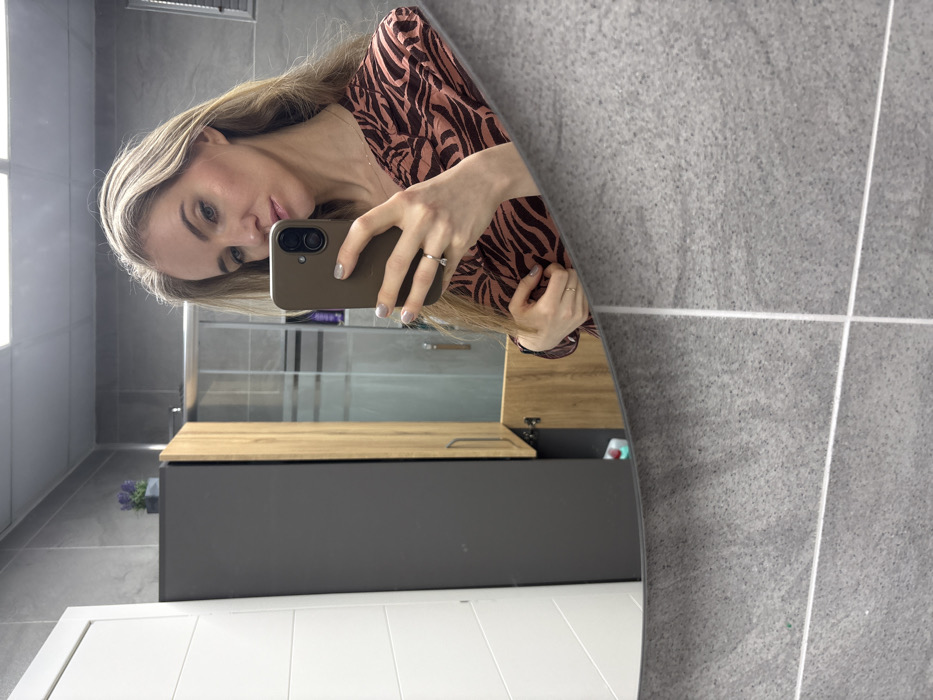 The scene depicts a modern bathroom in Esenyurt, Turkey. A fair-skinned female with long blonde hair, wearing a rust-colored top with a dark abstract pattern, is captured in a mirror selfie. She holds a dark olive-toned smartphone with a dual camera in her right hand, actively taking the photograph. A silver ring is visible on her left ring finger. The bathroom walls are tiled with large, light gray, speckled tiles and white grout lines. In the background, visible through the mirror, is a tall dark gray vertical cabinet to the left, and a light wood-toned vertical cabinet to its right, with its lower door ajar, revealing indistinct objects. A small decorative plant with purple flowers in a dark pot rests atop the dark gray cabinet. A glass shower enclosure with a vertical handle is visible in the upper background. A white, horizontal-paneled door or cabinet is partially reflected on the far left. The selfie is taken in a large, unframed mirror with a rounded bottom edge.