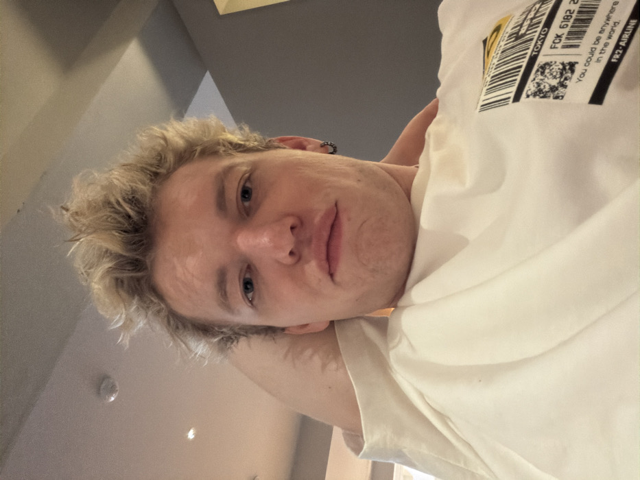 A fair-skinned young man with light blonde, somewhat disheveled hair faces the camera