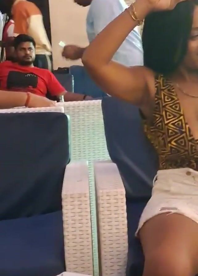 woman dancing in what appears to be a bar or lounge area. She is wearing a patterned top and white shorts and is seated on a blue cushioned chair with a white wicker frame. She has long, dark hair and is smiling. She is raising her arms and moving to music. Other people are visible in the background, some seated and some walking around. The environment includes other seating arrangements, a wooden table, a plant, and air conditioning units mounted on the wall. There is a purse and what appears to be a glass on the table in front of her. The overall setting is casual and social, with music playing and people enjoying themselves.
