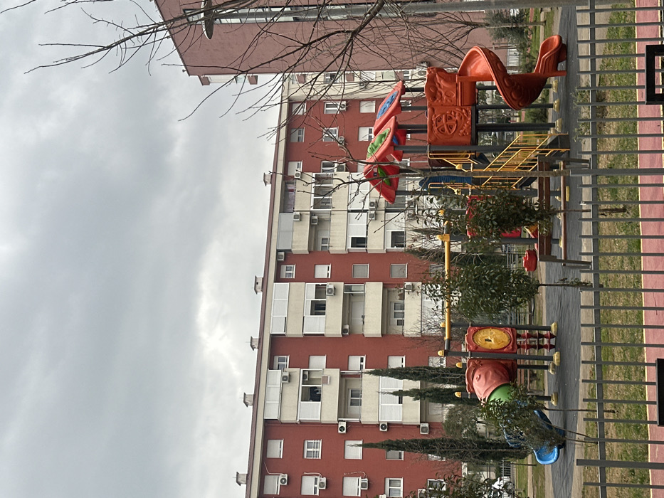 The image displays an urban residential scene in Podgorica, Montenegro, under an overcast grey sky. In the immediate foreground, a grey metal picket fence borders a children's playground. The playground features a dark ground surface and includes multiple pieces of equipment: a green and red structure with a small slide on the left, and a larger orange and yellow multi-level unit on the right comprising stairs, platforms, and a curved slide. A yellow horizontal bar is visible further back within the playground. Small, leafy shrubs and several bare-branched deciduous trees are scattered throughout the playground area. Taller, slender evergreen trees are positioned behind the left portion of the playground. In the background, a multi-story apartment building with a reddish-brown facade dominates the center. This building features numerous rectangular windows, many equipped with light-colored external roller shutters, and multiple white exterior air conditioning units mounted below windows or balconies. To the far right, a section of another reddish-brown building is visible, partially obscured by bare tree branches. The scene is devoid of any individuals.