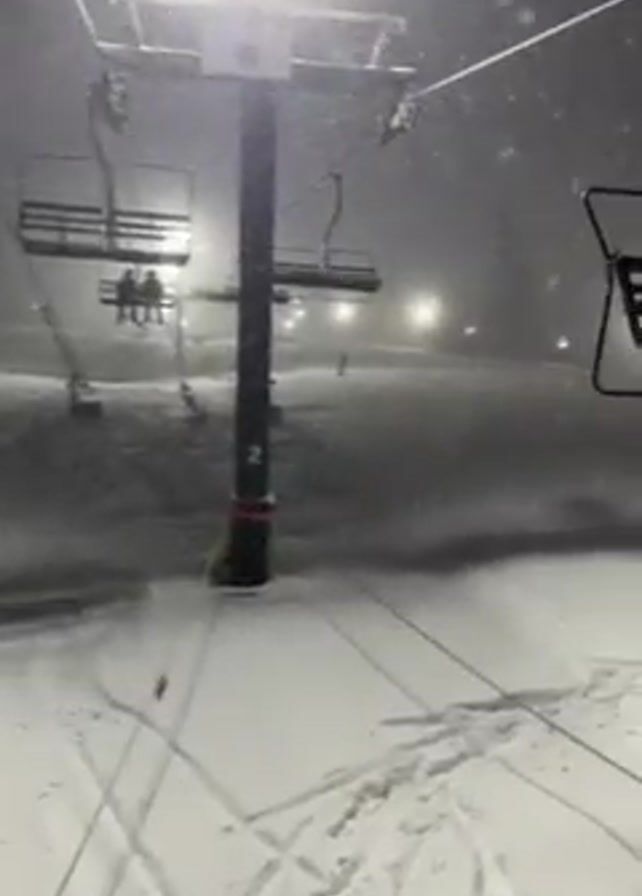 snowy scene at a ski resort at night. A ski lift is visible, with a couple riding uphill on one of the chairs. Snow is falling heavily, and the ski slope is illuminated by overhead lights. Ski tracks can be seen in the snow. The video seems to be taken from a stationary position near the base of the ski lift.