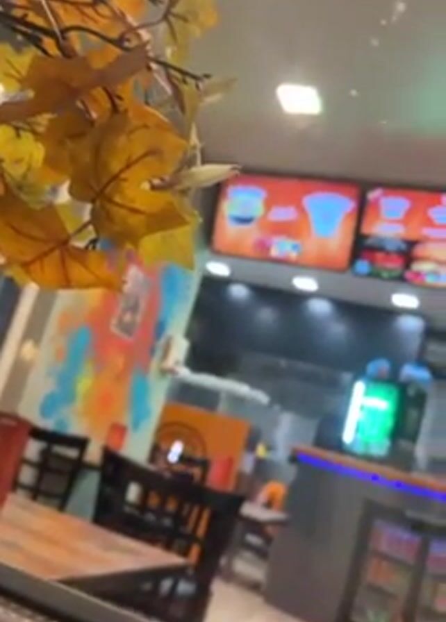 The camera pans upwards in a food establishment. The scene is slightly out of focus due to being filmed through glass and there are artificial yellow leaves obscuring the view in the foreground. Inside the establishment are wooden tables and black chairs. A colorful mural adorns one of the walls. Above the counter are digital displays showcasing the menu, including burgers, drinks, and other fast-food items. An employee wearing an orange shirt is visible behind the counter, preparing food. Below the counter, a refrigerated display case holds beverages. The overall lighting is bright and even.