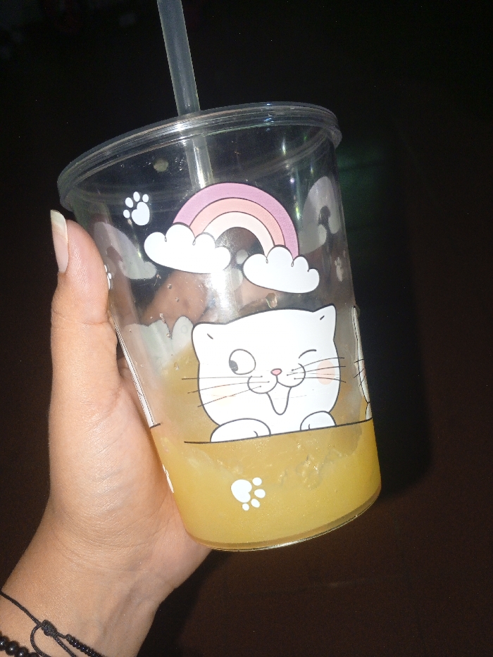 A close-up image displays a light-skinned hand, possibly female, holding a clear plastic cup with a lid and straw. The hand exhibits neatly manicured fingernails and a dark beaded bracelet on the wrist. The cup contains a yellowish, opaque beverage with visible ice chunks, approximately one-third full. The cup is decorated with cartoon decals: a pink, purple, and yellow rainbow with white clouds, and a winking white cat peering over the beverage line. White paw prints are scattered on the cup. The background is dark and indistinct, offering no discernible environmental details. The precise location within the city of Altagracia, Venezuela, cannot be confirmed visually from the image.