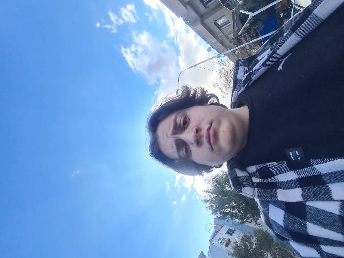 The image displays an upward-angled close-up of a single individual, identified as being in Barza Municipality, Syria. The person, a young adult with medium-length dark wavy hair, looks directly at the camera with a neutral expression. They are wearing a black long-sleeved shirt, over which is an open black and white checkered flannel shirt or jacket. A small black rectangular patch with white text is visible on the left chest of the black shirt, and a white logo (possibly a puma) is on the right chest. The background features a bright blue sky with scattered white clouds, indicating daylight. Urban structures are partially visible: to the left, a multi-story building with a light-colored facade and arched elements; to the right, a darker-toned multi-story building and a street lamp pole are present, partially obscured by trees. The scene is an outdoor urban environment.