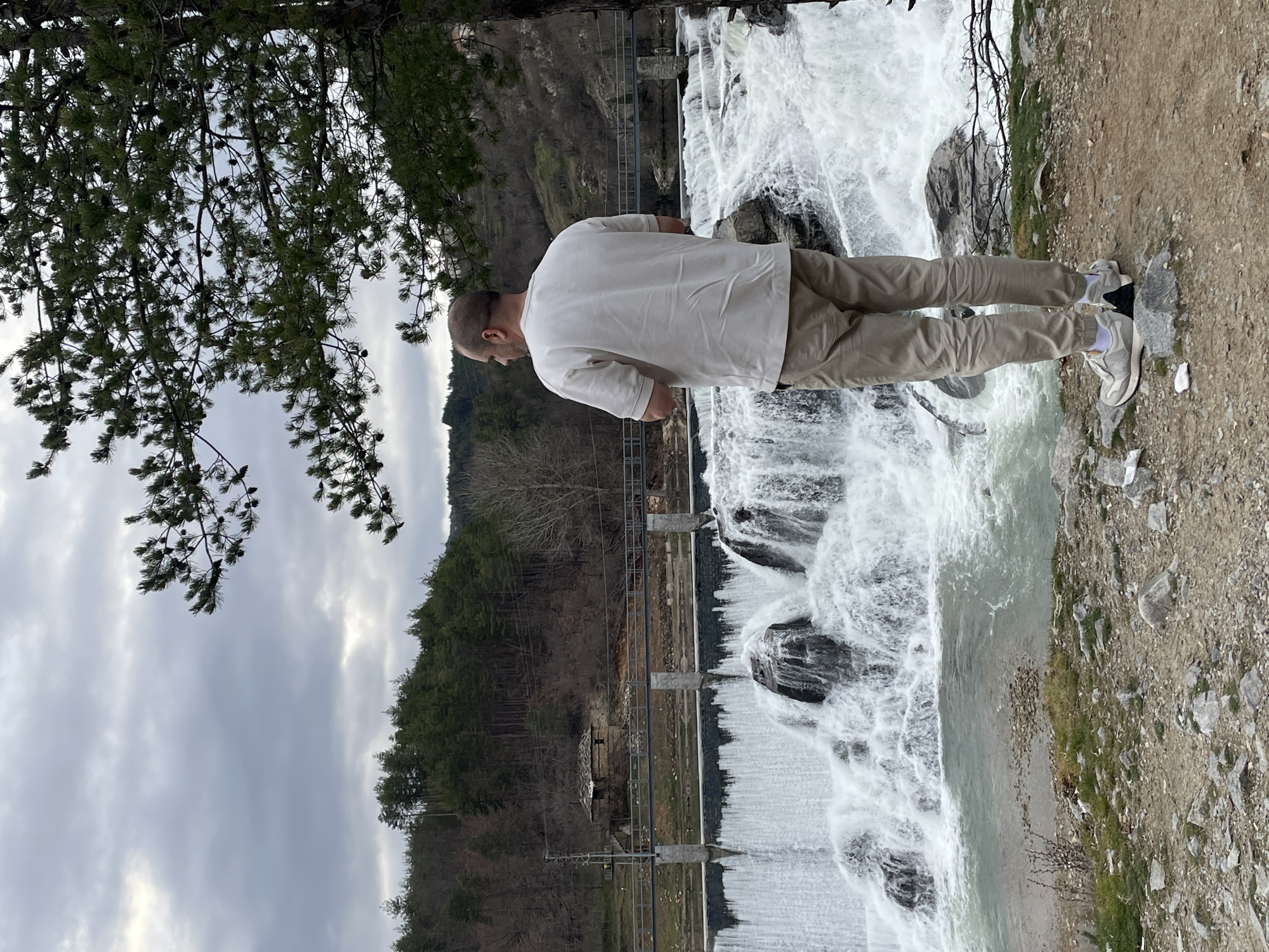 A man stands near a waterfall in Paspal, Bulgaria. The man is wearing a light-colored shirt, khaki pants, and sneakers. He is facing the waterfall. A tree is visible in the upper left. The waterfall is multi-tiered and flows over a dam. A small stone building is located at the base of the dam. The sky is overcast. The ground near the man appears to be rocky.