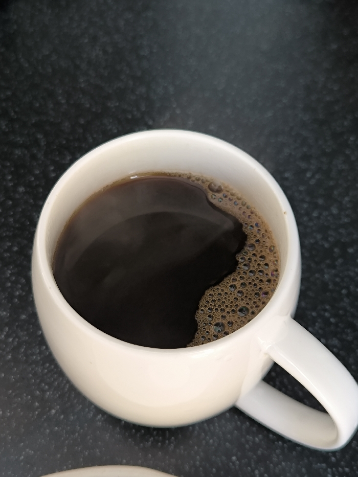 - "A white, round-bodied coffee mug filled with dark, steaming coffee sits on a dark speckled surface" by FM-dWhzM2, licensed under CC BY 4.0