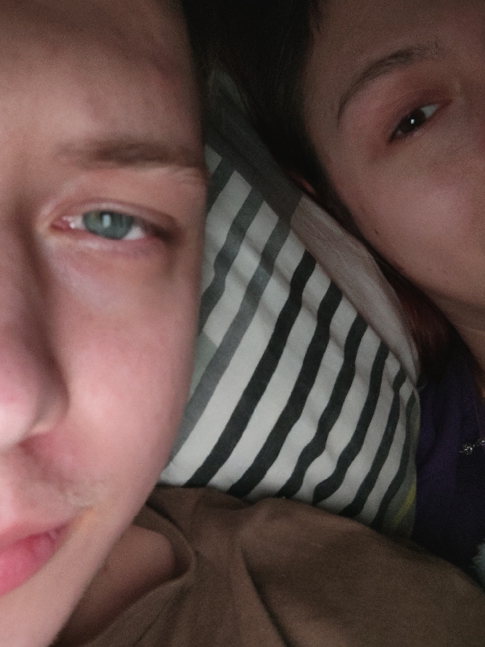 The scene depicts two individuals in an indoor setting, identified as Vratsa, Bulgaria. A person is present on the left side of the frame, showing the left half of their face including a visible left eye with a blue iris, a light brown eyebrow, and part of their nose and upper lip. Their skin tone is fair, and they are wearing a plain brown top. The left eye appears partially open. A pillow featuring a diagonal pattern of alternating grey and white stripes runs across the central horizontal plane, positioned between the two subjects. On the right, a second individual is partially visible, showing a portion of their right eye with a dark iris and part of their forehead. They are dressed in a purple garment with a small, shiny element visible near the neck. Their right eye also appears partially open. The entire scene is dimly lit. Both individuals are in close proximity, suggesting a shared resting space.