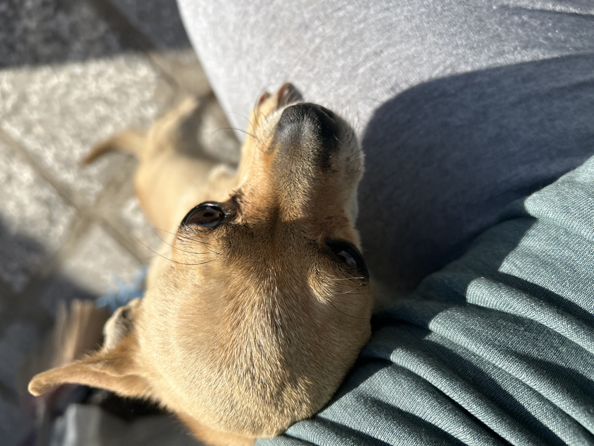 small, tan dog looking up at the camera. The dog is resting on someone's lap, who is wearing a gray top and a green long-sleeved shirt. The background shows a concrete surface and a sunny day with long shadows. The location in Koprivshtitsa, Bulgaria, is not definitively evident from the image.