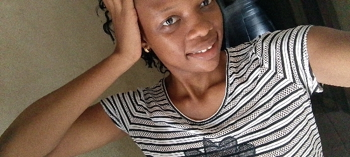 A single individual, a young adult female with dark skin and short, dark curly hair, is depicted in a close-up, slightly overhead shot within an indoor environment. She is looking directly at the camera with a partial smile, revealing her teeth. She wears a short-sleeved top with horizontal black and white stripes, incorporating patterned horizontal bands. Small gold-colored hoop earrings are visible on both ears. Her left hand is raised, with fingers resting near her left temple. To the left and lower portion of the frame, a light-colored, textured surface is visible. To the upper right, a dark blue or black textured object is partially discernible. Sections of her legs are visible in the lower frame. Location: Unknown, Unknown.
