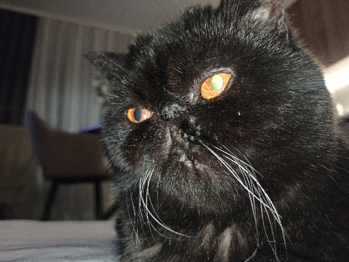 A close-up shot features a black cat with striking orange and greenish eyes. The cat's fur is dark and dense, contrasting with its white whiskers. A portion of a gray chair is visible in the background, with blurred wall elements further back. The cat dominates the frame, its facial features and intense gaze capturing the viewer's attention.