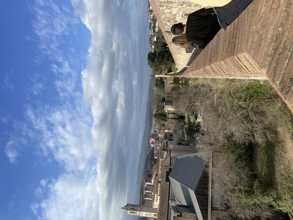 From atop a stone wall, a scenic view unfolds. A couple peers over the wall, overlooking a cityscape of red-tiled roofs and a prominent church steeple. Beyond the buildings, a landscape of trees and greenery stretches into the distance, meeting a horizon of rolling hills. The sky is a mix of bright blue and heavy clouds, creating a dramatic contrast over the scene. The architectural elements of the wall, with its brick and stone construction, add a sense of history and elevation to the perspective.