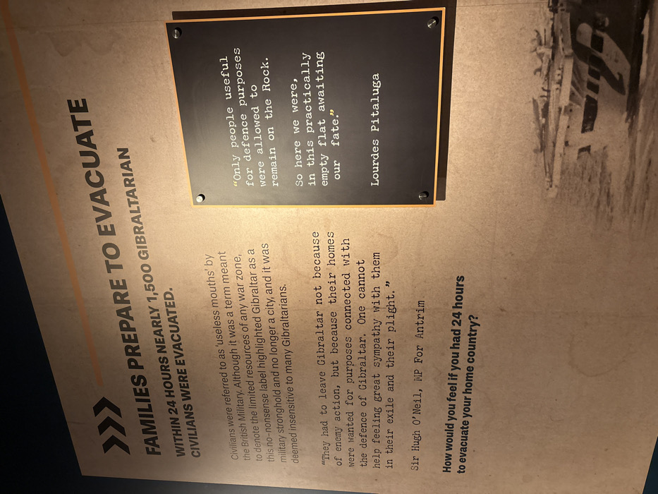 The scene depicts an interior view of a historical exhibition display, likely located within a museum in Gibraltar, Gibraltar. A large, vertically oriented, light-brown textured panel, resembling kraft paper, is mounted against a dark wall background. The panel features dark brown text, prominently titled "FAMILIES PREPARE TO EVACUATE." Below the title, a subtitle reads, "WITHIN 24 HOURS NEARLY 1,500 GIBRALTARIAN CIVILIANS WERE EVACUATED." Further paragraphs explain the British Military's term 'useless mouths' for civilians and include a quote from Sir Hugh O'Neil, MP For Antrim, discussing the evacuation for defence purposes. A reflective question, "How would you feel if you had 24 hours to evacuate your home country?", is positioned at the bottom left. To the right of the main brown panel, a smaller, rectangular black panel with a distinct orange border is affixed by four metallic standoffs. This black panel displays white text, quoting Lourdes Pitaluga about remaining on "the Rock" and awaiting fate. Partially visible at the bottom right of the main brown panel, beneath the black quote panel, is a black-and-white image depicting an aircraft carrier with multiple aircraft on its deck. The exhibit is illuminated by artificial lighting, and no individuals are present in the frame.