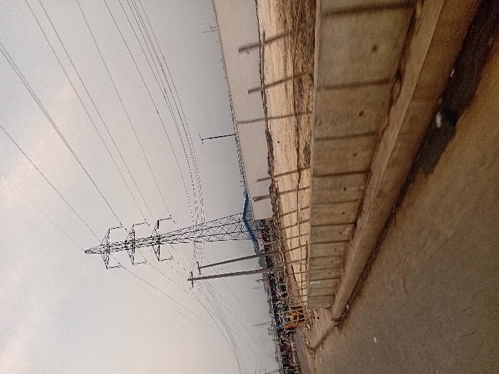 An overhead power line supported by a steel lattice transmission tower dominates the left side of the image under a cloudy sky. Adjacent to the tower, a concrete barrier or wall with exposed rebar runs along the right edge. Below the wall, a road stretches into the distance, lined with a cluttered array of objects that could be cars or other items. The image is taken from a low angle.