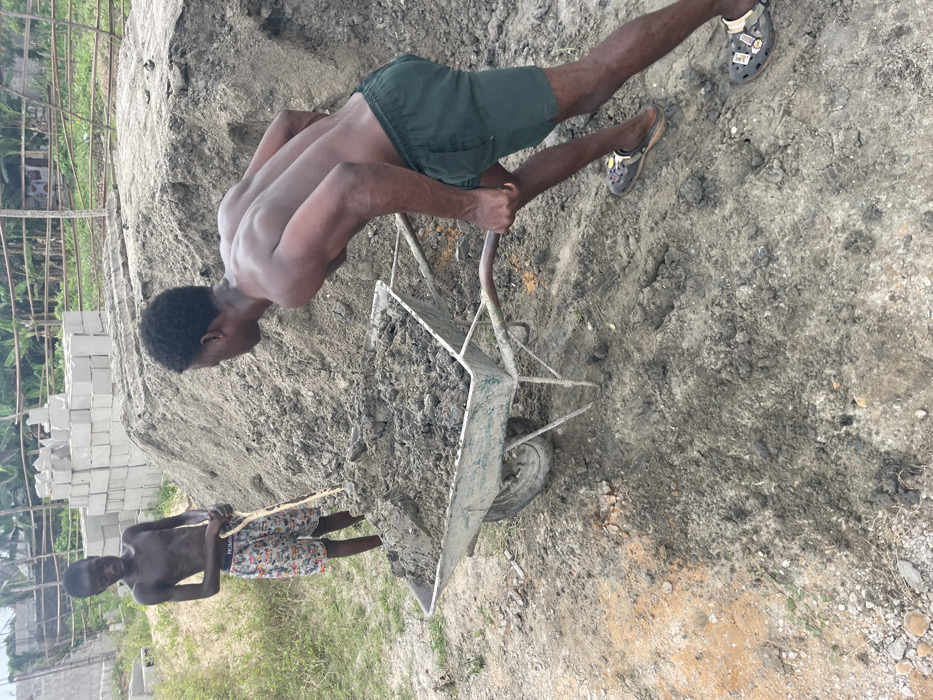 In Ajara, Nigeria, two shirtless male individuals are engaged in manual labor on a construction site
