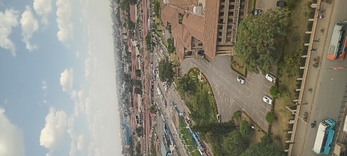 This high-angle, daytime photograph depicts a detailed urban landscape in central Nairobi, Kenya, primarily showcasing the Nairobi Railway Station complex and its immediate vicinity. The upper third of the image features a light blue sky with scattered white cumulus clouds. In the foreground, a multi-lane asphalt road (identified as Haile Selassie Avenue) traverses horizontally. A light blue public service vehicle, consistent with a "matatu" style bus, is partially visible on the left, facing right. An orange and grey double-decker bus is partially visible on the right, facing left. Approximately ten indistinct pedestrians are observed walking on the sidewalk adjacent to the road, separated by a low, light-colored fence. To the right of the foreground road, a landscaped area with grass, trees, and shrubs precedes a prominent multi-story building featuring a reddish-brown tiled roof, light-colored walls, and classical columns. This structure is identified as part of the Kenya Railways Headquarters. A paved parking lot in front of this building contains several white sedans and one dark vehicle. To the left of the Kenya Railways Headquarters, a large, irregularly shaped paved area functions as a significant parking facility, populated by numerous light-colored and dark vehicles, including several smaller buses or vans. This area is bordered by additional green spaces with mature trees and curved access roads. In the mid-left and background, the extensive Nairobi Railway Station complex is visible, characterized by multiple railway tracks, station platforms, and associated structures. Several stationary train carriages or entire trains are discernible on the tracks. Beyond the railway infrastructure, a dense urban sprawl of predominantly low-to-mid-rise buildings extends into the hazy distance, indicative of a vast metropolitan area.