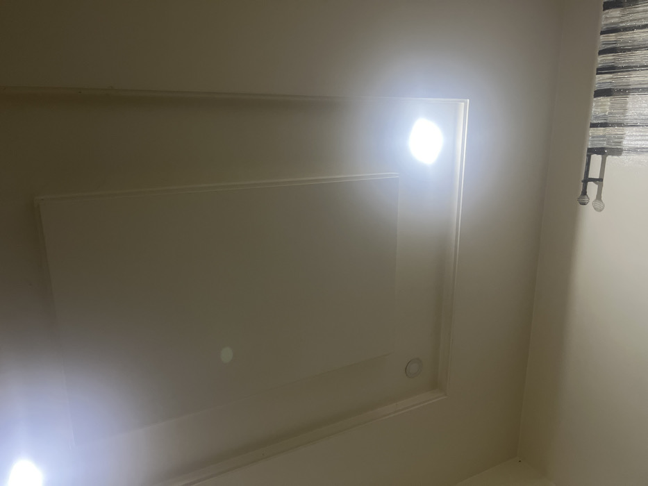 The image presents an upward-angled view of an indoor ceiling and the upper portion of an adjacent wall in Lokoja, Nigeria. The ceiling is a light-colored, possibly off-white, suspended panel system featuring a large, central rectangular recess bordered by decorative molding. Two circular recessed light fixtures are active within the ceiling; one in the lower-right area of the main recess emits a bright glare, and a second, less intense fixture, is visible in the upper-left section of the recess. A faint circular reflection or minor fixture is also discernible near the center of the main recessed panel. The upper part of the wall, visible at the bottom of the frame, is painted a matching light, neutral color. A dark-colored curtain rod with two decorative, ridged finials is mounted on the wall's lower right, from which a vertically striped curtain, displaying alternating dark and light bands, hangs partially. No people or discernible actions are present within the frame.