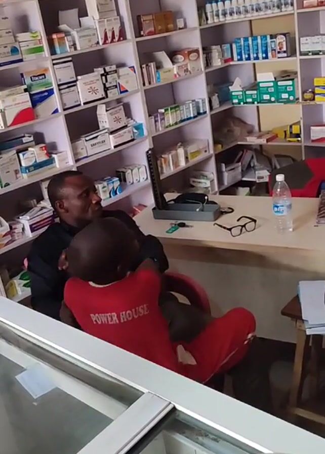 An eye-level indoor shot of an African pharmacy depicts two individuals: an older, darker-skinned man dressed in a black long-sleeve shirt and a child wearing a red outfit with "POWER HOUSE" printed on the back. The man is seated with the child on his lap in front of a counter. Behind them, shelves filled with medicine boxes and various pharmaceutical products are visible. On the counter, there's a blood pressure monitor, a pair of glasses, a bottle of water, and some papers. The child is facing away from the camera, while the man is looking at the child and gently holding the child's hand. A display case is positioned at the bottom of the frame.