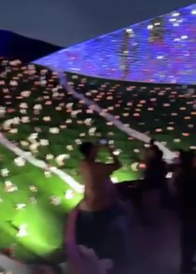 crowd of people under a large, tent-like structure decorated with lights. The roof of the structure has an irregular shape and is covered with blue and white lights arranged in a grid pattern. Below the roof, there's a layer of green material with white and orange decorations resembling flowers or candles. People are standing and walking around, some taking photos or videos with their phones. The overall scene has a festive or celebratory atmosphere. The video is slightly shaky and moves around, capturing different parts of the crowd and the decorated structure.
