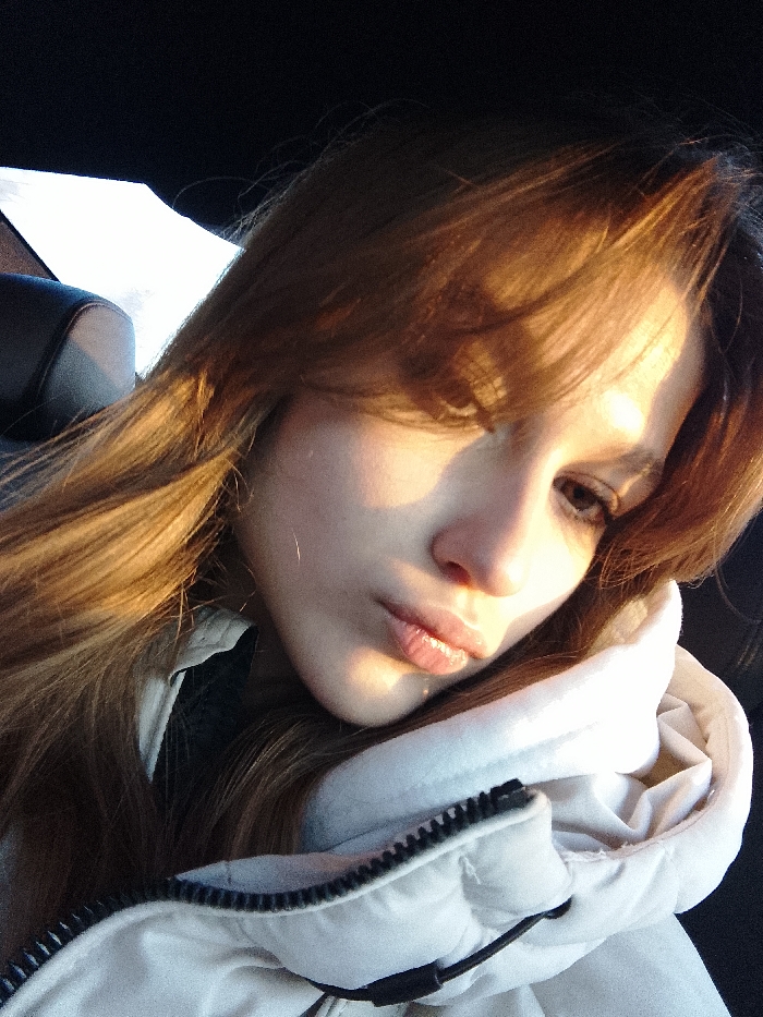 One female subject, appearing to be a young adult, is depicted in a close-up, chest-up self-portrait. She has long, light brown hair styled with strands across her forehead and right side of her face. Her right eye is visible and dark; her left eye is partially obscured by hair and shadow. Her lips are full, slightly parted, and pursed in a pout. She wears a light-colored, possibly white or very light beige, puffer jacket with a black zipper and a black drawstring with an adjuster visible at the neck. A dark inner garment is visible beneath the jacket. The scene is illuminated by a strong, warm light source from the viewer's right, highlighting her hair and the right side of her face, creating a pronounced shadow on the left side of her face. The background indicates an indoor, vehicle interior setting, with a dark, possibly black, headrest visible in the upper left quadrant and an indeterminate bright white object or surface above it. The subject is looking directly towards the camera. Location: Unknown, Unknown.
